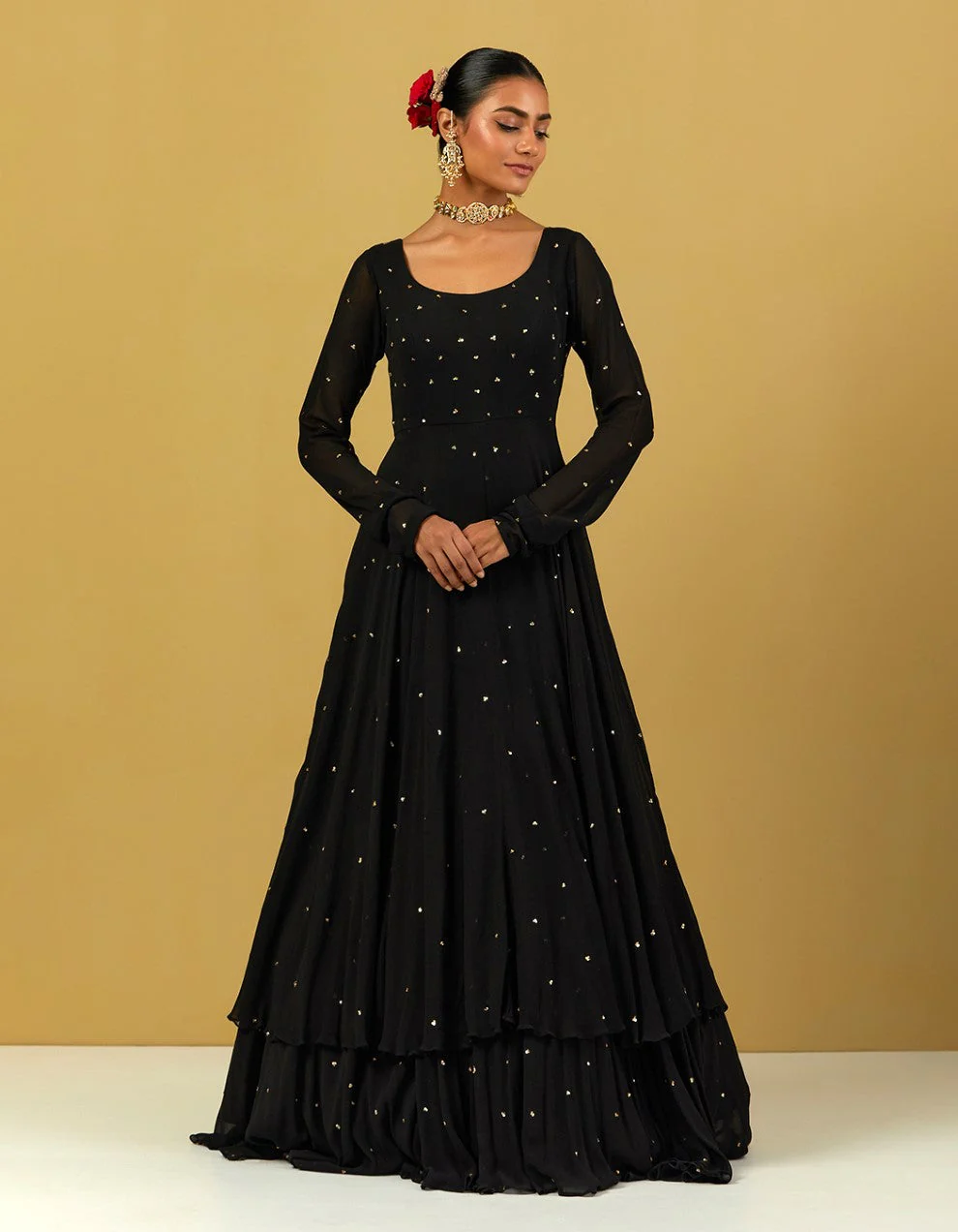 A traditional yet contemporary silhouette- the gown carries the boldness, fierce energy, and classic elegance of black. A must-have for the wedding season, this ensemble is chic enough to keep you in the spotlight and ethnic enough to help you shine through the crowd. Carrying the charisma of the georgette and tissue fabric, the gown is embellished with seasoned handwork. Complete the traditional look by tucking the heavily embroidered net dupatta with it or ditch the dupatta for a bolder statement look.Â