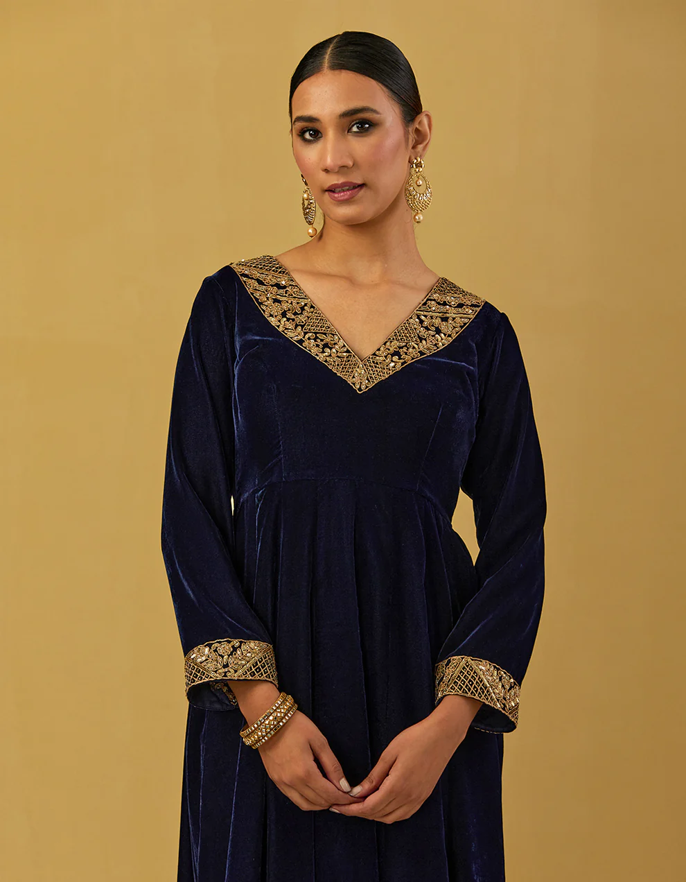 Having a “what to wear to stay warm and look like a diva” moment? Answer it with the “Zoya Collection.” Carrying the sheen finesse and warmth of the luxe silk velvet, the 3-piece Anarkali set exudes everything charismatic. Crafted with bright and regal winter hues, this ethnic regalia showcases the awe-struck beauty of an Anarkali suit, being enhanced with delicate and expertly done dori, sequins, and cutdana work. Get your Indian wear wardrobe sorted for winter with this timeless beauty. Head to the “Add To Cart” button and take it home!