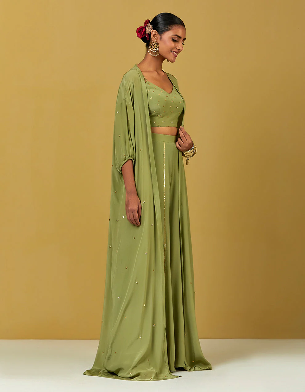 Balancing style and comfort, this celebratory outfit is a fine example of Indian ethnic wear designed for today's women. Constituting a green hand-embroidered (sequins & cheeta work) blouse, pant, and an overlay jacket, this show-stopping look is best reserved for wedding celebrations. Whether you are looking for a bridesmaid outfit that helps you fulfill your duties while adoring the spotlight or an ideal ensemble for your bridal trousseau, this crop top set keeps a check on all your wedding season outfit goals.