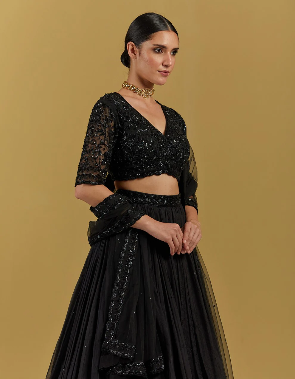 A modern classic- Black on black hand embroidery blends seamlessly in this eternally graceful crop top. The crop top is elevated with floral designs, a v-neck, and a stunning sheer-back design that catches the attention like no other. The black net crop top with sequin and thread work is a fit that works best with skirts, palazzos, and pants to create a perfect ethnic wear outfit for festivities and grand celebrations.