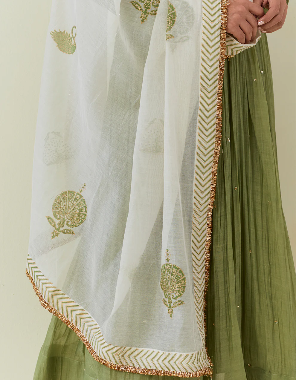 Infuse joy into your every moment with a sumptuous green anarkali set from our ‘Malang’ collection. Evoking a sense of cultural richness, each piece is a canvas of artistry where age-old block printing work and sequin embroidery with lace work create a contemporary allure. Wrapped in the plush softness of light chanderi, with an eye-catching flair, the silhouette encapsulates the very essence of traditional meets modern in unparalleled elegance and grace.  Â