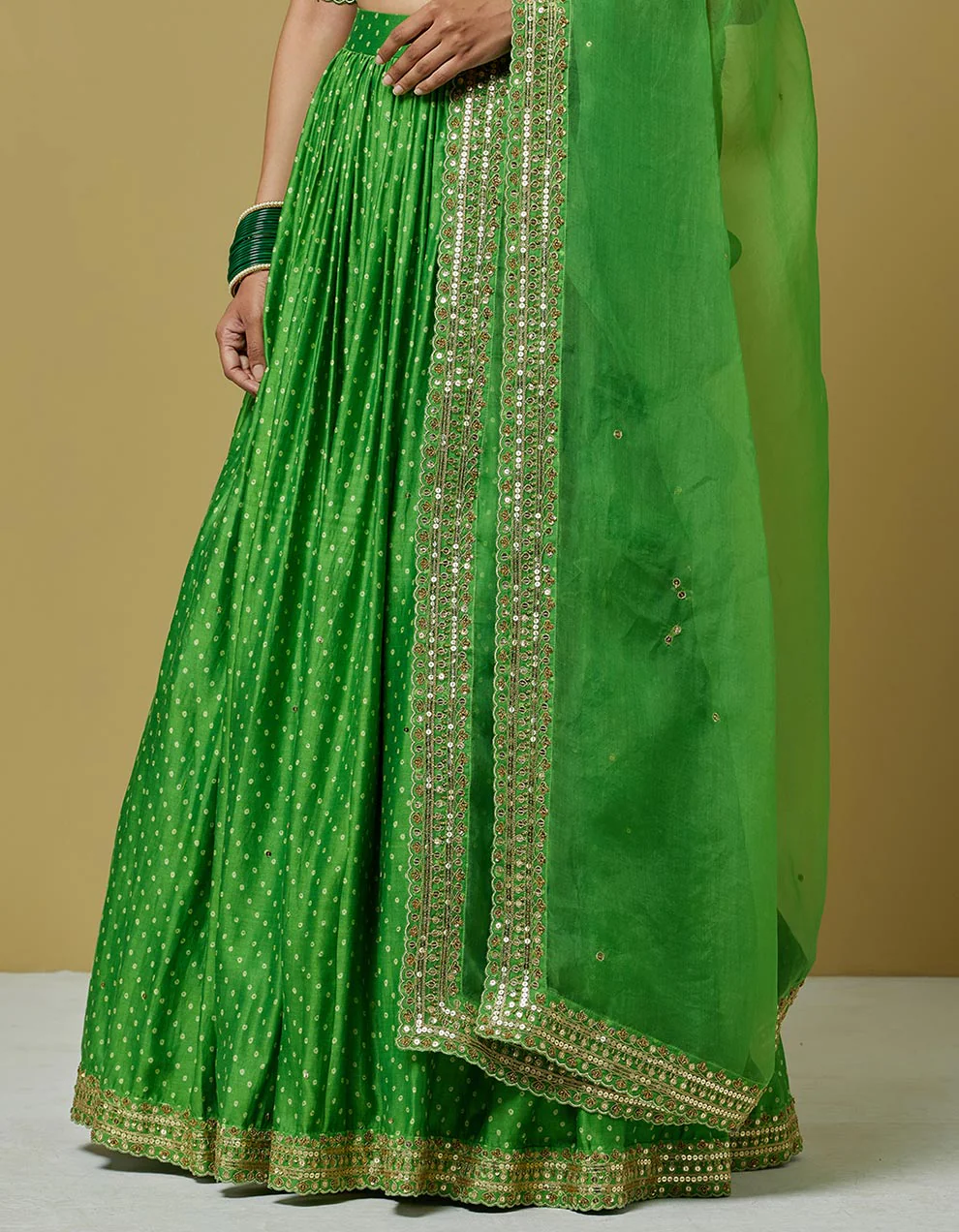 Waltz gracefully into events in this festive-worthy embroidered printed green lehenga set that comes with a stunning flared skirt, a v-neck blouse, and a matching organza dupatta embellished with sequin work and beautiful Dori detailing. Adorn this lightweight and one-of-a-kind masterpiece lehenga and channel elegance. Make this beauty yours now!
