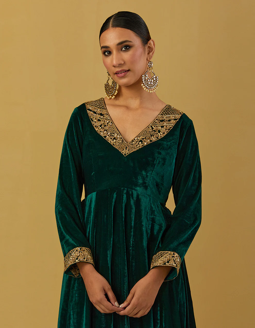 Having a âwhat to wear to stay warm and look like a divaâ moment? Answer it with the âZoya Collection.â Carrying the sheen finesse and warmth of the luxe silk velvet, the 3-piece green embroidered anarkali set exudes everything charismatic. Crafted with bright and regal winter hues, this ethnic regalia showcases the awe-struck beauty of Anarkali suits, being enhanced with delicate and expertly done dori, sequins, and cutdana work. Get your Indian wear wardrobe sorted for winter with this timeless beauty. Head to the âAdd To Cartâ button and take it home!