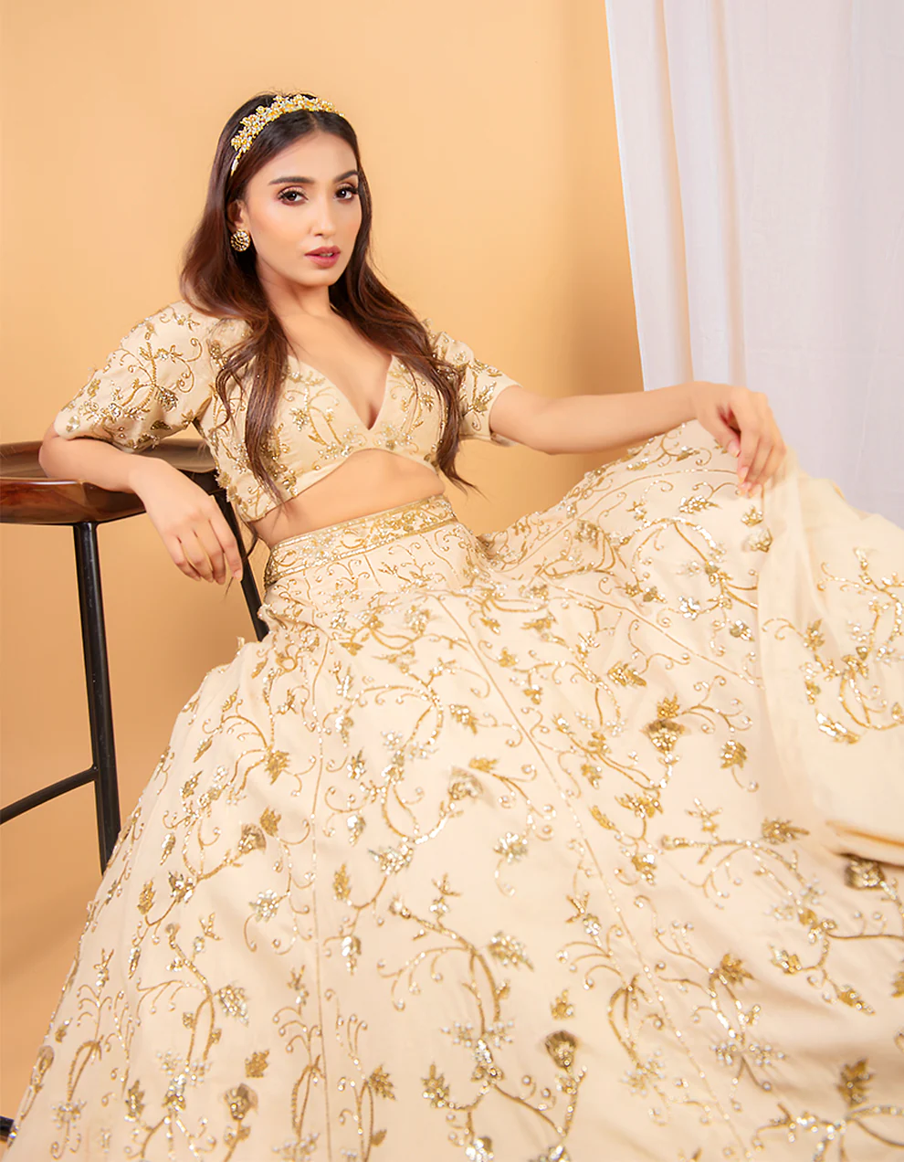 No matter if you need a celebratory wedding reception outfit or a morning wedding dress, let yourself steal the spotlight. Balancing ethnicity and modern style- this voluminous cheese cotton lehenga set flaunts the wedding season outfits' goals. Flaunting a modern vibe, this ivory lehenga comes with a deep neck blouse and a designer dupatta and is embroidered with Zari & Moti work.