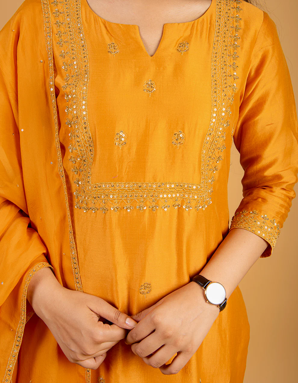 Discover the irresistible markdown of Chanderi Silk fabric embedded with the intricate details of tissue organza and sequins embroidery. Exemplifying the art of weaving golden threads i.e. zari work and being inspired from “the land of Nawabs” this silhouette flaunts a mustard chanderi silk kurta. Tie the look together with straight-cut silk pants stitched to perfection.