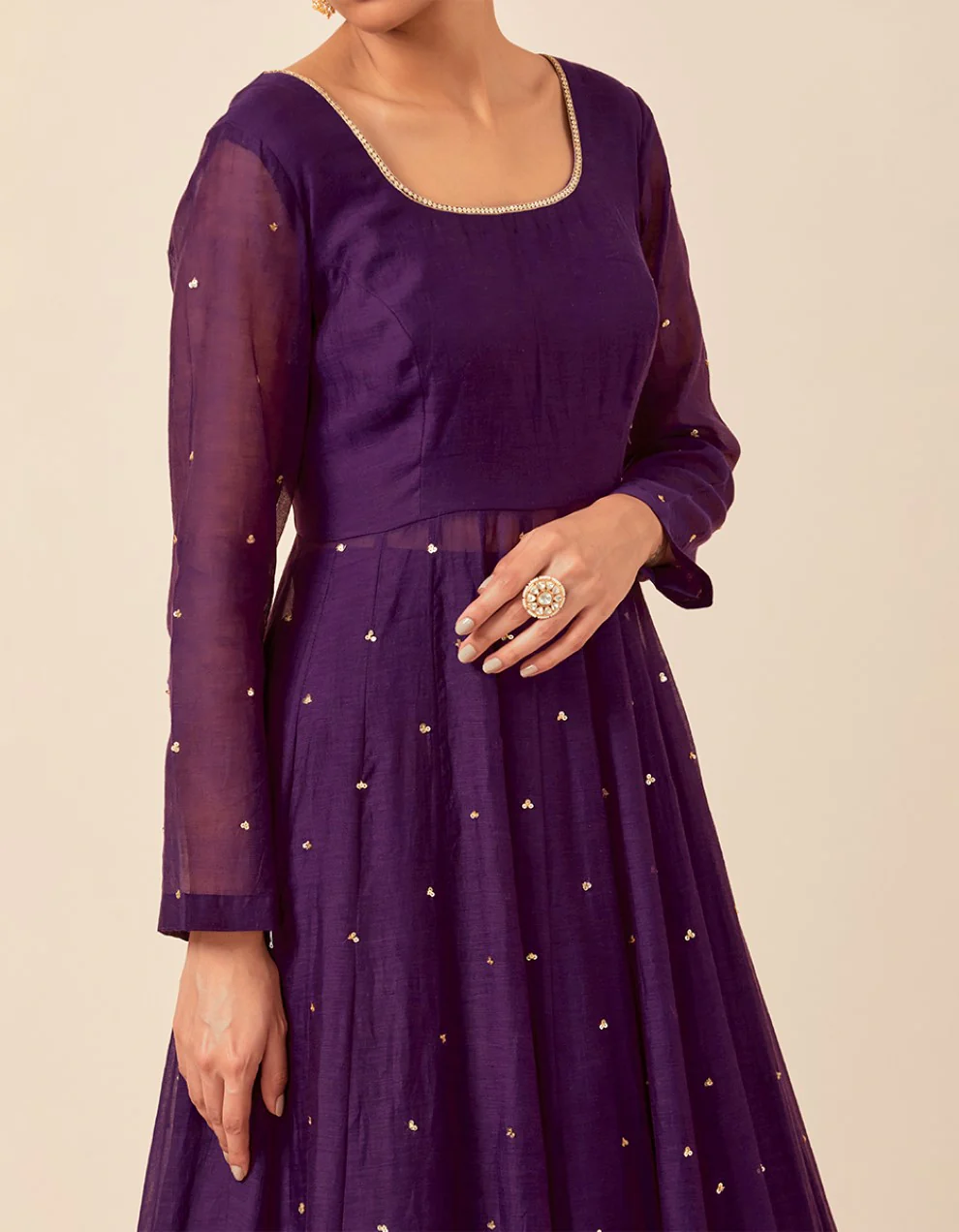 Own the spotlight this celebratory season with an Anarkali that is traditional yet contemporary and is accentuated just for you. Delivering the finest notes of seasoned hand embroidery, the Albeli collection flaunts an Anarkali ensemble loaded with the luxe of the finest chanderi. Exhibiting the ideal amalgamation of traditional ethnic wear and contemporary aesthetics, the two-piece suit set showcases an Anarkali kurta with a voluminous skirt. Wrapped in the noble shade of purple hue, this ensemble is a must-have for your wardrobe.