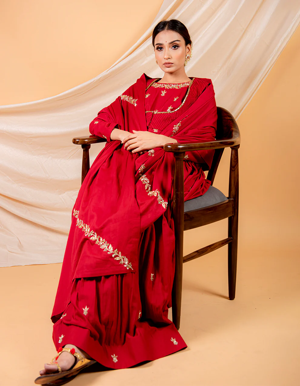 Red Hand-Embroidered Floor-Length Suit with Pintuck Jacket and Dupatta