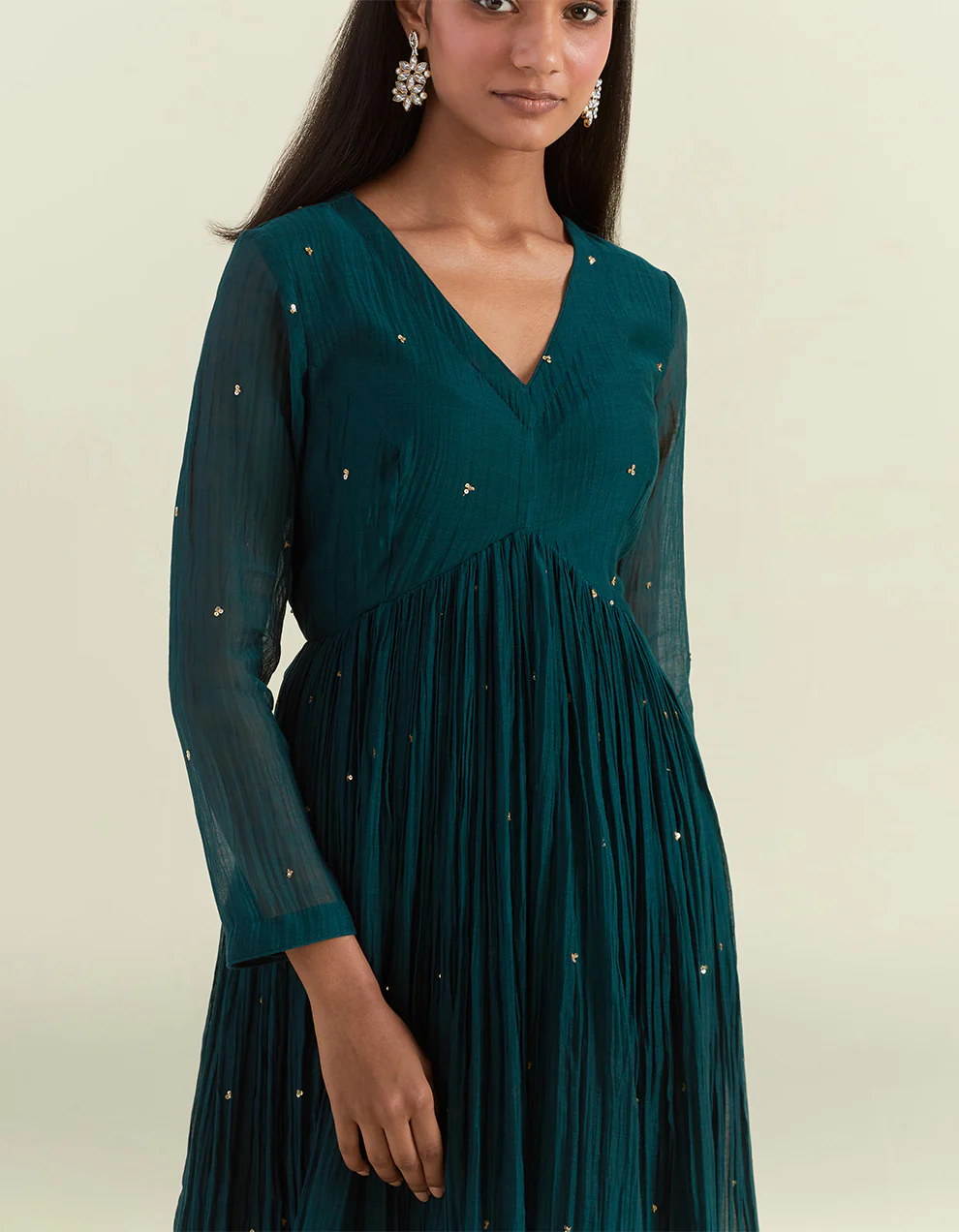 Infuse joy into your every moment with a sumptuous teal anarkali set from our ‘Malang’ collection. Evoking a sense of cultural richness, each piece is a canvas of artistry where age-old block printing work and sequin embroidery with lace work create a contemporary allure. Wrapped in the plush softness of light chanderi, with an eye-catching flair, the silhouette encapsulates the very essence of traditional meets modern in unparalleled elegance and grace.  Â