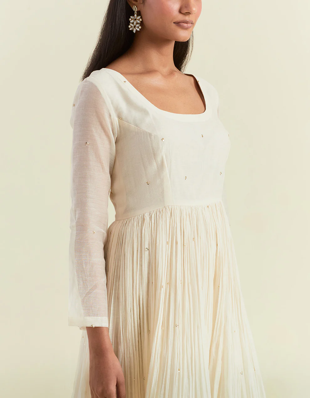 Infuse joy into your every moment with a sumptuous white anarkali set from our ‘Malang’ collection. Evoking a sense of cultural richness, each piece is a canvas of artistry where age-old block printing work and sequin embroidery with lace work create a contemporary allure. Wrapped in the plush softness of light chanderi, with an eye-catching flair, the silhouette encapsulates the very essence of traditional meets modern in unparalleled elegance and grace.
