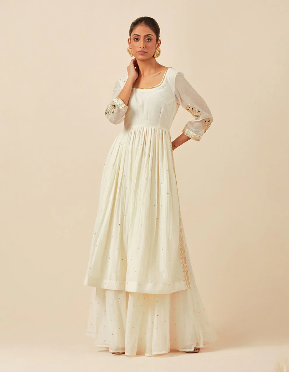 Own the spotlight this celebratory season with an Anarkali that is traditional yet contemporary and is accentuated just for you. Delivering the finest notes of seasoned hand embroidery, the Albeli collection flaunts an Anarkali ensemble loaded with the luxe of the finest chanderi. Exhibiting the ideal amalgamation of traditional ethnic wear and contemporary aesthetics, the two-piece suit set showcases an Anarkali Suit with Sharara pants. Wrapped in the purest shade of white hue, this ensemble is a must-have for your wardrobe.Â