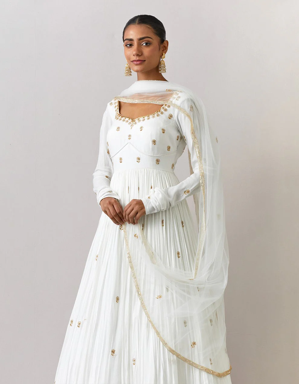 White hand embroidered modal cotton gown and net dupatta