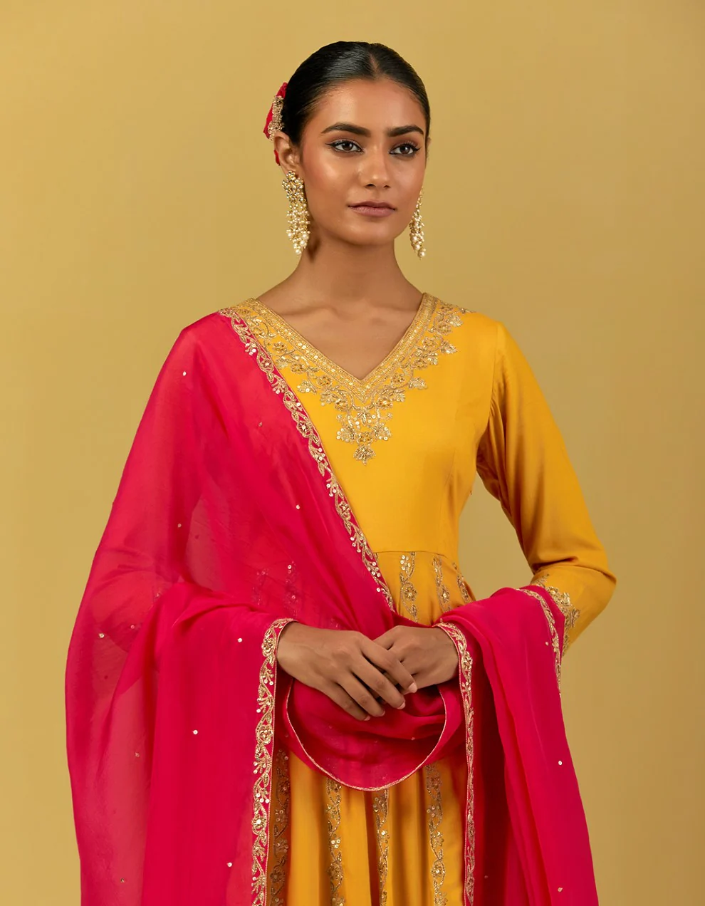 The timelessness of Anarkali wrapped in the comfort of modal cotton. This yellow & magenta three-piece suit set flaunts everything handcrafted and everything beautiful. Showcasing an anarkali kurta paired with pants and dupatta the silhouette exemplifies simplicity and grace. Ideal for a variety of occasions in your social calendar, this one is a wardrobe essential.